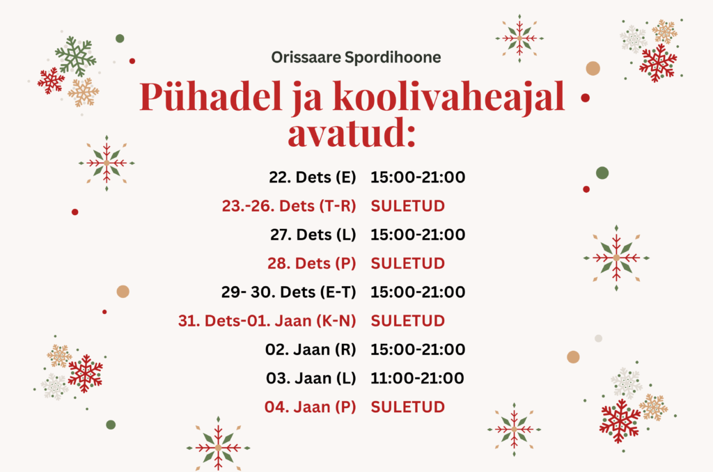 Orissaare Spordihoone on pühade ja koolivaheaja perioodil avatud järgmiselt: